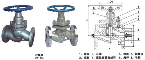 柱塞閥是由閥體、閥(fá)蓋、閥杆、柱塞(sāi)、孔(kǒng)架、密環、手輪等零件組(zǔ)成(如圖)。當手輪(lún)旋轉時,通過閥杆(gǎn)帶動柱(zhù)塞在孔架(jià)中間上下往複運動來完成閥門的開啟與(yǔ)關閉功能。