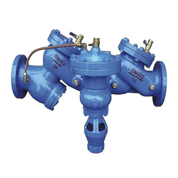 HS41X-A)帶過濾防汙隔斷(duàn)閥(fá)由兩個隔(gé)開的止回閥和一(yī)個液壓(yā)傳動到泄水閥組成,第一個止(zhǐ)回閥閥體內裝有過濾網。由於止回閥的局部(bù)水頭損失,中間腔內的壓力始終低於入水口的壓力。這個壓差驅使泄水(shuǐ)閥處於關閉狀(zhuàng)態,管路正常供水。在壓力異常時,(即出口(kǒu)端壓(yā)力高於中堅腔(qiāng)),即使兩個止回閥都不能反向密封,安全泄水閥也能自動開啟將倒流水泄空,並形成空氣隔斷,保證上遊供水衛生(shēng)安全(quán)。