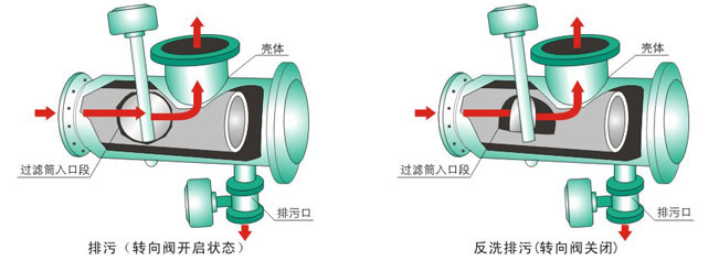 該過濾器由殼體、不鏽鋼過濾筒網、雜質(zhì)收集(jí)段、雜質排出口(kǒu)及水(shuǐ)流轉向閥組成。按安裝型式及水流方向(xiàng)的不同分為直通式和直角(jiǎo)式兩種。