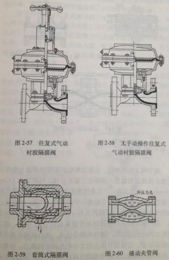 氣動形式的隔膜閥可裝反饋信號、限位器及定位器等裝置,一適應自控、程控或調節流量的(de)需要。氣動隔膜(mó)閥的反饋信號采用無觸點傳感(gǎn)技術。該產品采用薄膜式推進氣缸替代活塞氣缸,排除了活塞環易損壞造成泄(xiè)漏,從而導(dǎo)致(zhì)無法推動閥門起、閉的弊端。當氣(qì)源發生=故障時,還可操縱(zòng)手輪使閥門啟、閉。堰式(shì)隔膜閥的機構如圖2-53所示,直通式隔膜閥的機構如圖(tú)2-54所示,直流式隔膜(mó)閥的機構如圖2-55所(suǒ)示,針(zhēn)形隔膜閥的機構如圖2-56所示,往複(fù)式氣動襯膠隔膜閥的機(jī)構如(rú)圖2-57所示,無(wú)手(shǒu)動操作(zuò)往複式氣動襯膠隔膜閥(fá)的機構如圖2-58所(suǒ)示(shì),套筒式隔膜閥的機構如圖5-59所示,液動(dòng)夾管閥的機構如圖5-60所示,電磁驅動型夾管(guǎn)閥的機構如圖2-61所示,單(dān)動壓(yā)杆式管夾閥的機構如圖2-62所示,雙動壓杆式管夾閥的機(jī)構如圖2-63所示。