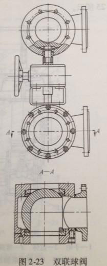 該種球閥的機構如圖2-23所示,為雙聯L形浮動(dòng)三通(tōng)球閥。該種球閥用一(yī)個手柄或蝸輪蝸杆手動裝置操縱兩個L形三通球閥兩(liǎng)個動作必須完全同步,使一(yī)個出(chū)於開啟狀態,另一(yī)個則出於(yú)關閉狀態。閥座密封圈采用聚四氟(fú)乙烯(PTFE)製造用螺栓壓緊閥蓋,實現密封。閥(fá)體與閥(fá)蓋連接處(chù)設有調整墊片,以調整預緊力,閥座底部設有蝶形彈簧,齒輪(lún)箱(xiāng)與一球閥用支架固(gù)定連接,與另一個球閥(fá)用活動接頭連接,要保證兩個球閥閥杆同軸,兩個球閥閥杆連接方(fāng)向成180°