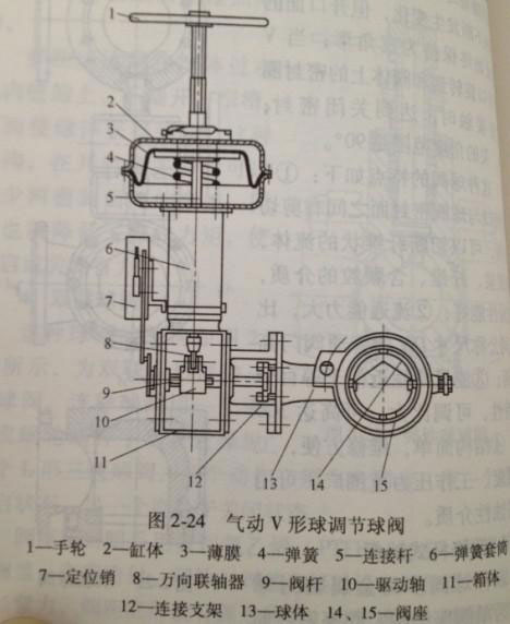 其機(jī)構如圖2-24所示。它在球體上(shàng)開有一個V形通(tōng)道(dào)口,隨著球體(tǐ)的旋轉,開口的(de)麵(miàn)積不斷發生變化,但開口(kǒu)麵的形狀始終保持為三(sān)角形;當V形開口旋轉到和閥體上的密封圈緊密接觸時,達到關閉密封;開(kāi)、關的角(jiǎo)度範(fàn)圍是(shì)90°