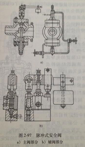 3.脈衝式安(ān)全閥:脈衝式安全閥又稱先導式安全閥。它把主閥和輔閥(fá)設計在一(yī)起,通過輔閥的脈衝作用帶動主閥動作,這種機構通常用於大口(kǒu)徑(jìng)、大排(pái)量及高(gāo)壓(yā)係統。脈(mò)衝式(shì)安全閥如圖2-97所(suǒ)示,其a為主閥部(bù)分,圖b為輔閥部分。
