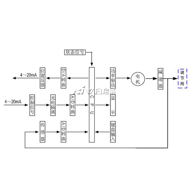 電動執行(háng)機構是以(yǐ)電動機(jī)為驅動源、以直流電流為控製及反饋信(xìn)號,原(yuán)理方塊圖如圖3所示。當(dāng)控製器的輸入端有一個信號輸(shū)入(rù)時(shí),此信號與位置信號進行比較(jiào),當(dāng)兩個信號的偏差值大(dà)於規定的死(sǐ)區時(shí),控製器產生功(gōng)率輸出,驅動伺服電動機轉動(dòng)使減速器的輸出軸朝減小這一偏差的方向轉動,直到偏差小於死區為止。此時輸出軸就穩定在與輸入(rù)信號相對應(yīng)的位置上。