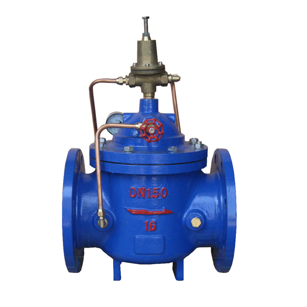 當水泵工作閥門(mén)向下遊供水(shuǐ)時,電磁導閥全開,針閥調至適當開度(dù),上遊水經針閥、單向閥進入主閥控製室,經電磁導閥(fá)流出,此時(shí)主閥控製室的壓力(lì)保持主閥處於合適的開度,保持下遊正常供(gòng)水(shuǐ)。